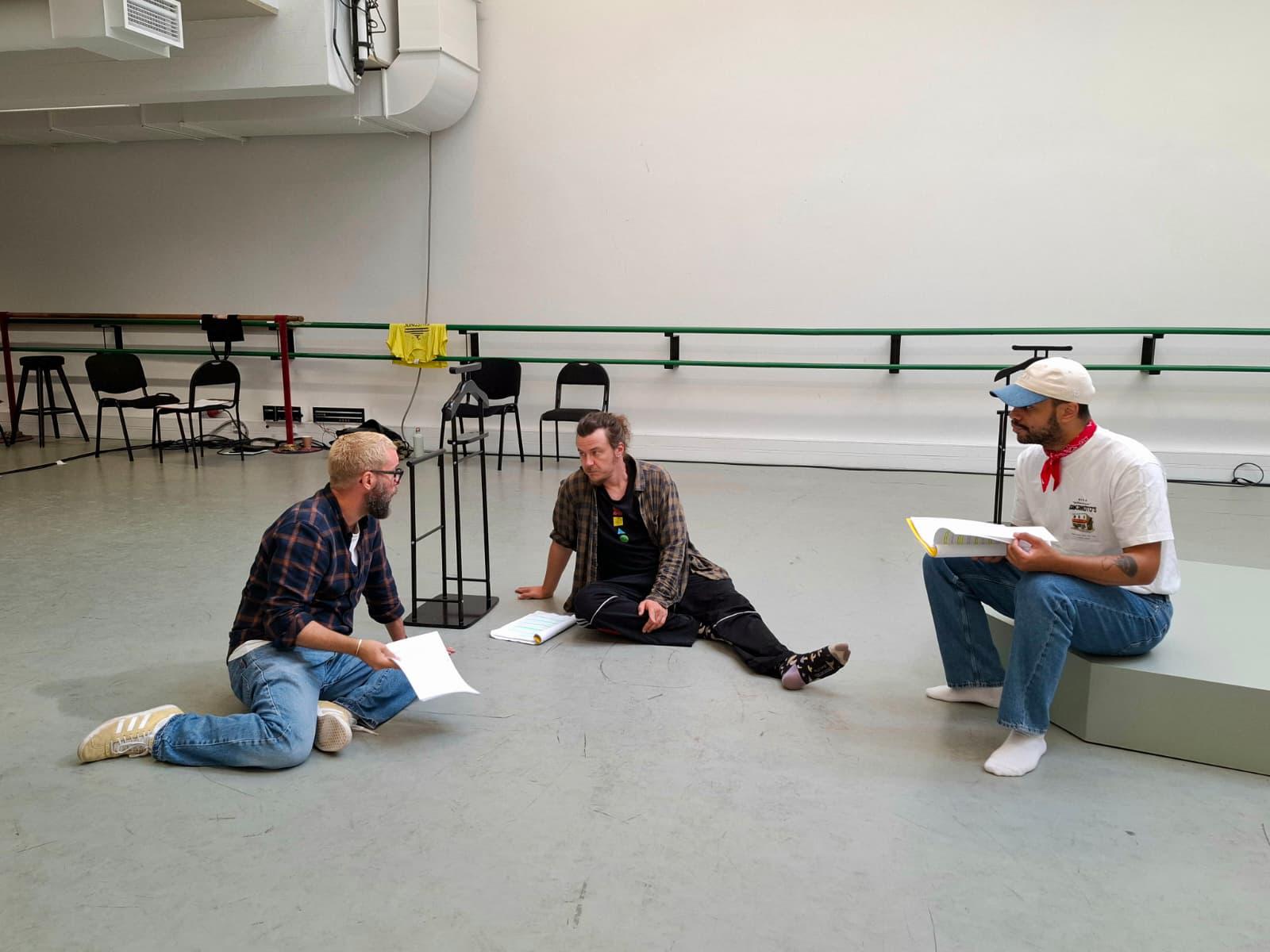 He ovat harjoitelleet kohtauksen kerrallaan ja heittäneet huumoria niiden välissä. Läpimenossa tasapainottava huumori jäi kuitenkin pois.